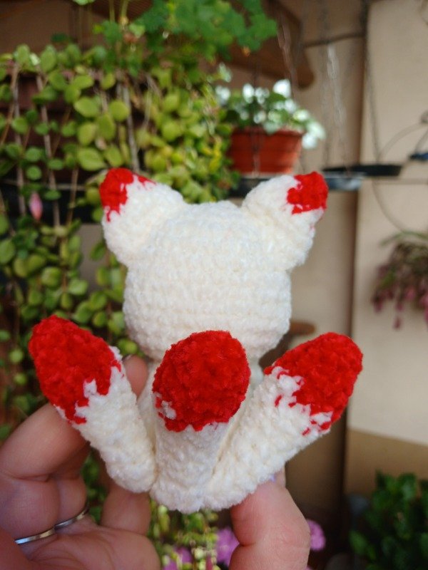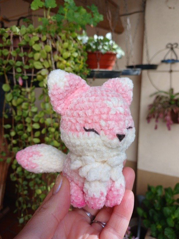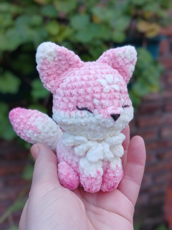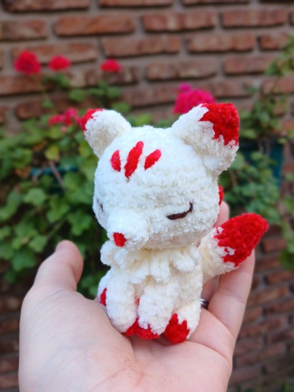 Tierno zorrito Kitsune. En versión pequeña y adorable Con tres colas. Tejido en chenille, peludito y suave. 11 cm de alto
