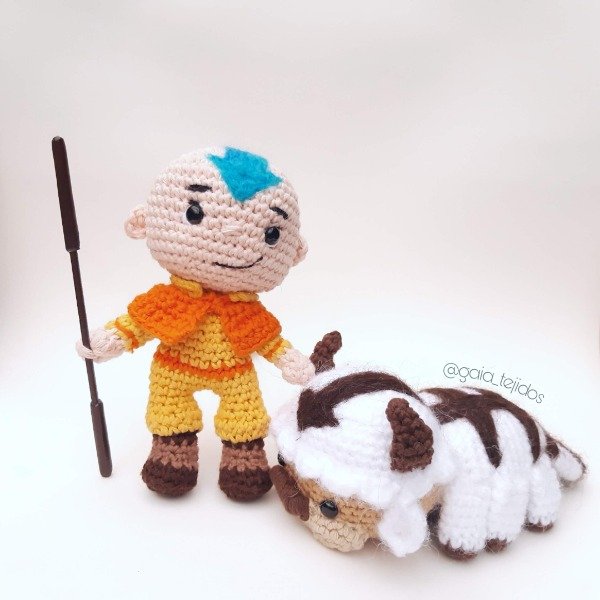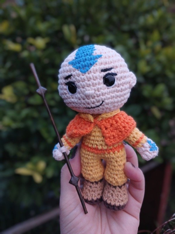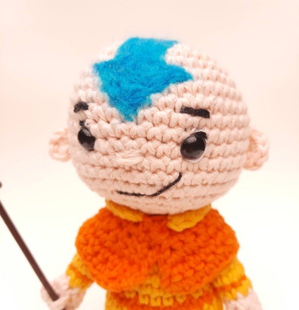 Personaje protagonista de la serie animada "Avatar: la leyenda de Aang". Tejido en hilo de algodón hipoalergénico, con ojos de seguridad. 16 cm de alto. Detalles en cabeza y manos con pintura acrílica para tela