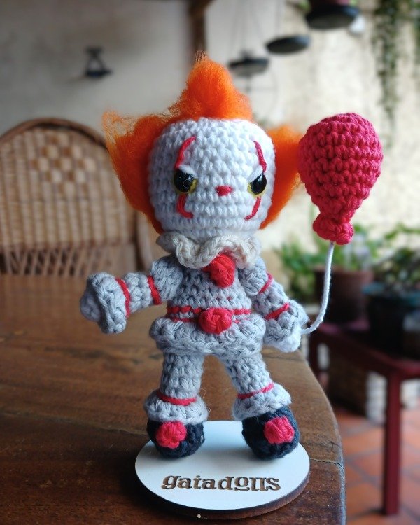 Pennywise, pequeñas versiones tejidas de los Personajes clásicos de las pelis de terror. Altura: 16 cm. Cuerpo articulado con estructura interna, en brazos y piernas. Incluye el globo. Incluye la base removible para que quede en pie