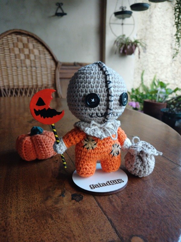Sam o Samhain. Personaje principal de la película "Trick 'r Treat" del 2007. El muñeco esta tejido en hilo de algodón,con ojos de botón, brazos articulados. Incluye base para que quede en pie y todos los accesorios que se ven en la foto ( calabaza, chupetín y bolsa).Medidas: 15 cm de alto aproximadamente