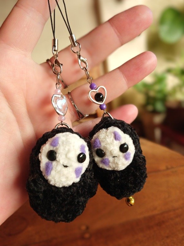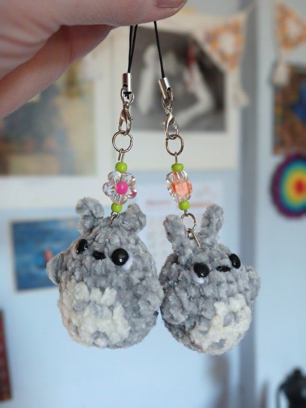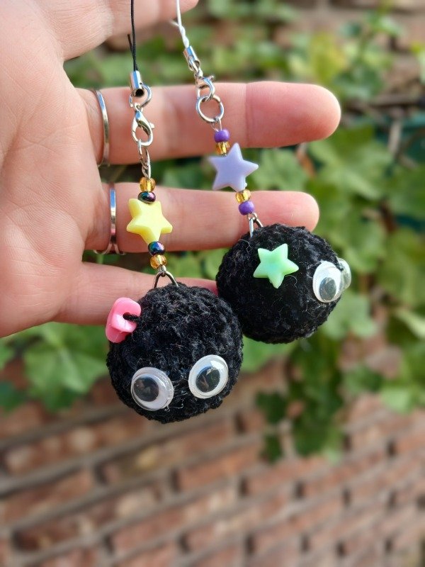 Charm con colgante para celu. Tiernos modelos tejidos en chenille, con detalles de dijes, cuentas y mostacillas. Puede haber ligeras variaciones de color y formas en los dijes y adornos