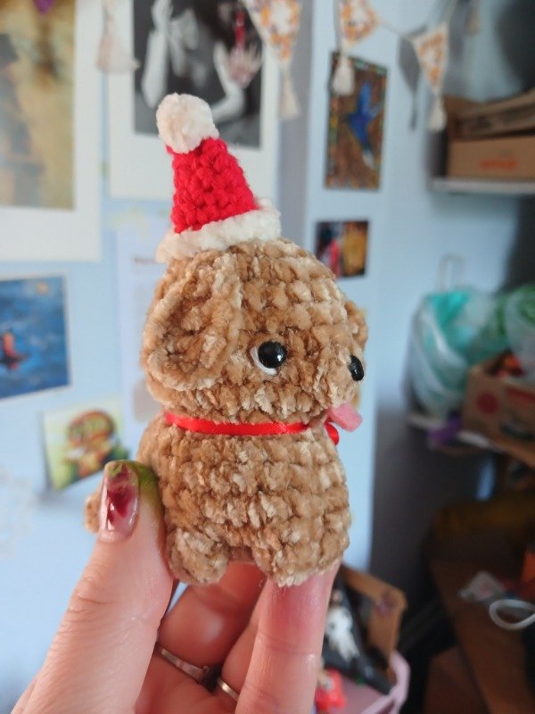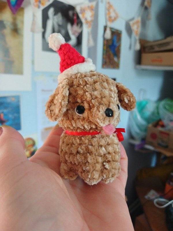 Simpático perrito tejido en chenille con gorrito Navideño. Tiene 8 cm de alto sin el gorro