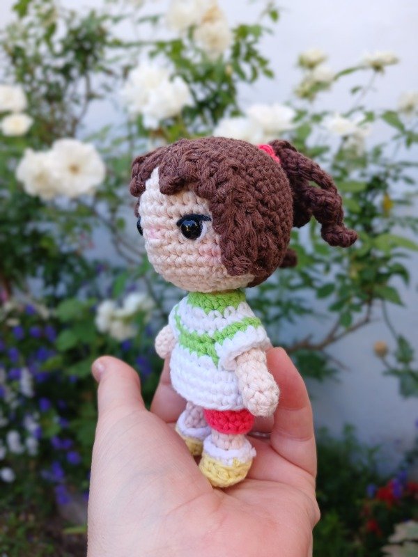 Chihiro de la pelicula de Studio Ghibli. Articulada para que pueda posar tejido en hilo de algodón, con ojos de seguridad. Tiene 12 cm de alto. Incluye la base para que quede en pie
