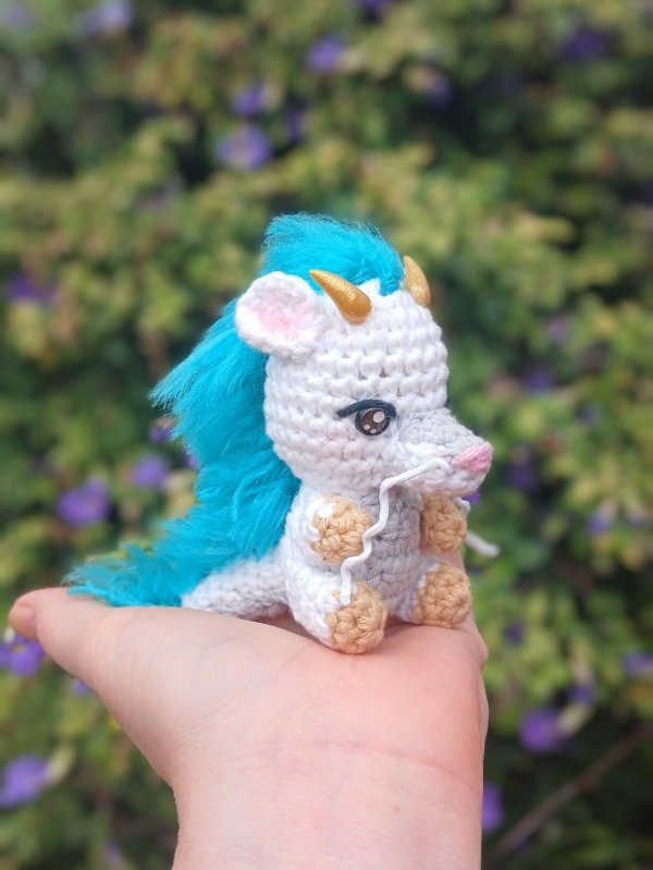 Haku Chibi. Pequeño dragón personaje de la película "Ell viaje de Chihiro" Tamaño: 10 cm de alto. Tejido en hilo de algodón hipoalergénico y con lana acrílica cepillada. Cuernitos en porcelana fría pintada y laqueada.