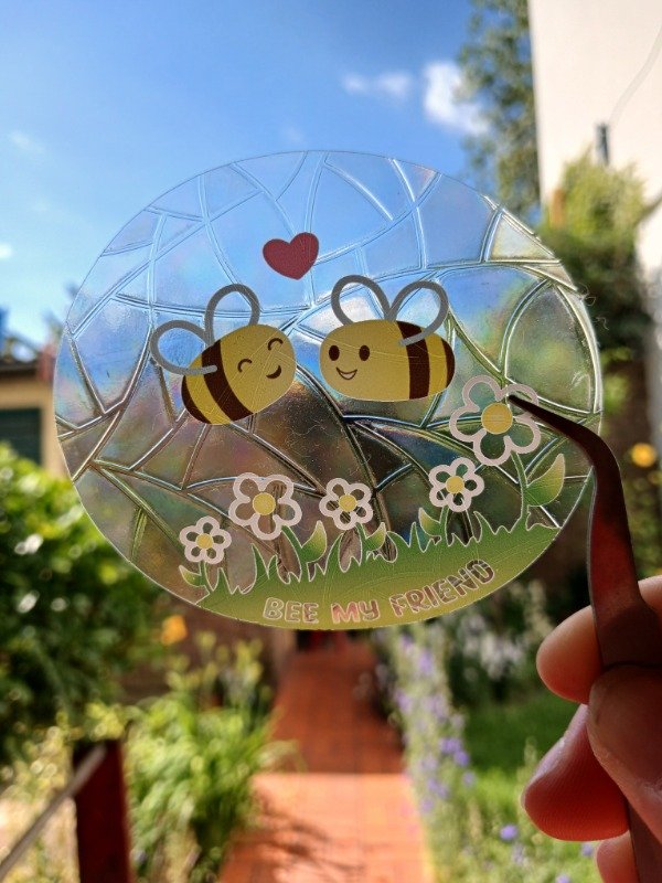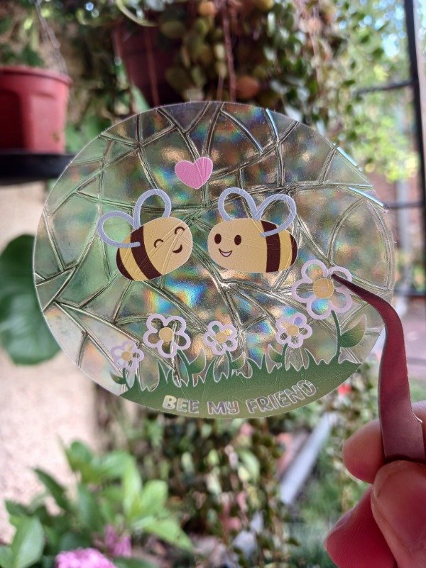 Vinilo autoadhesivo transparente de 8 cm con efecto atrapasol. Al pasar el sol por la ventana donde esta pegado genera un efecto arcoiris sobre las superficies